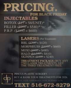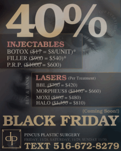With Clinically Trained Nurse Practitioners, Physician Assistants, And Aestheticians, We’re Prepared To Meet Your Beauty Needs With The Highest Level Of Care. On Black Friday, You’ll Text Pincus Plastic Surgery At 516-672-8279 To Buy & Bank Your Treatments For 2026. This Special Is With Our Aesthetics Team, Not Dr. Pincus. All Sales Are Final And Cannot Be Combined With Other Offers. This Special Does Not Apply To Surgical Fees. Mark Your Calendar!
